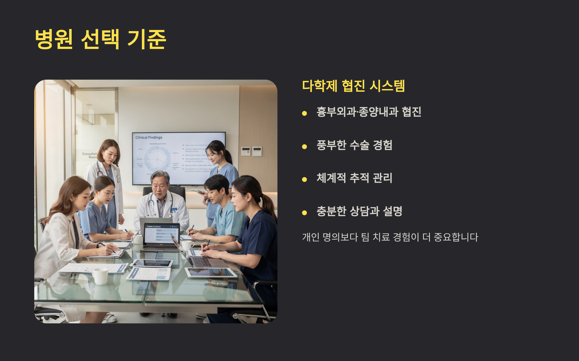 다학제 진료 시스템이 잘 갖춰진 병원이 유리합니다.