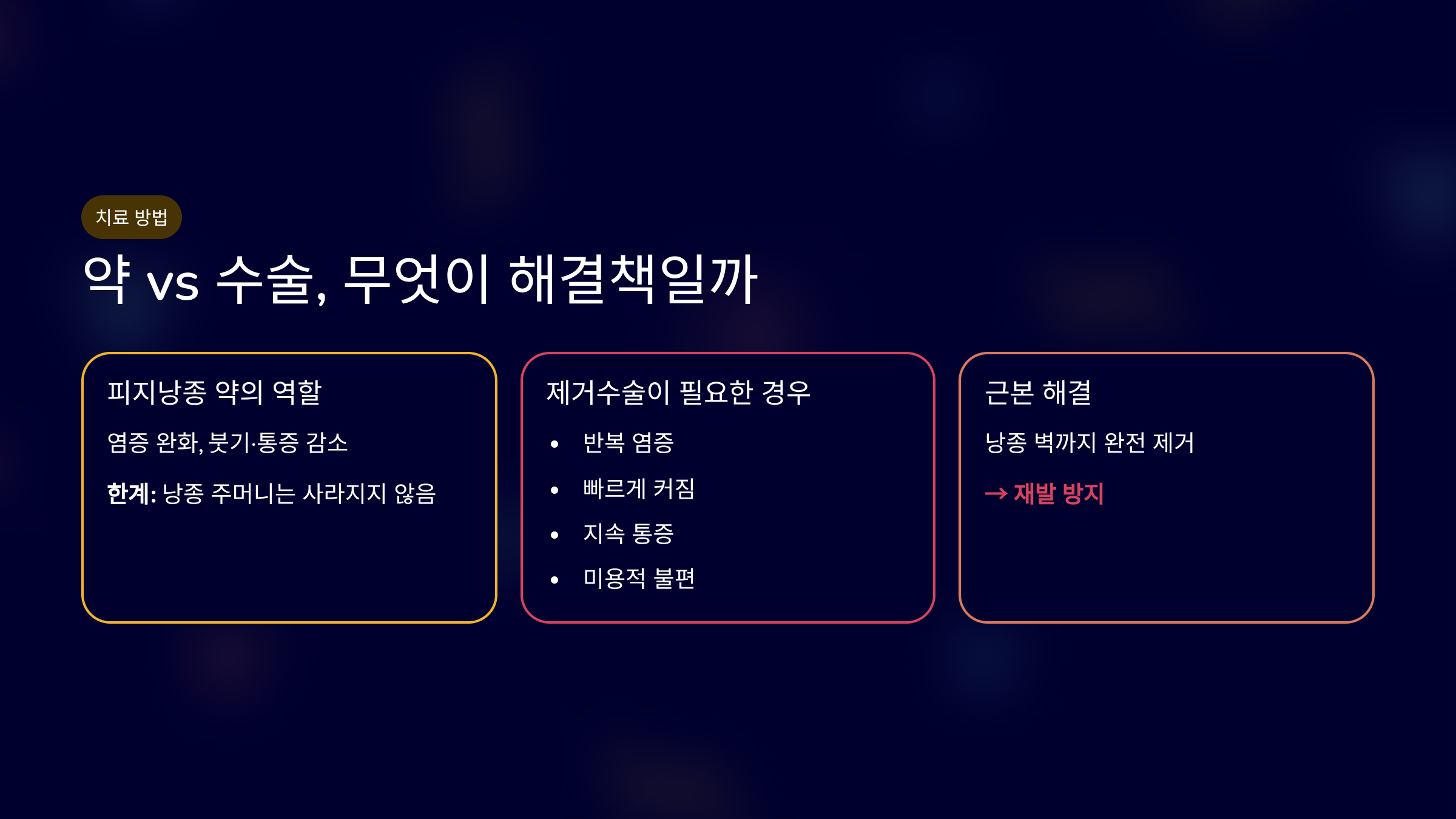 약은 염증을 줄이는 수단이고, 근본 해결은 제거수술로 낭종 벽까지 없애는 것입니다.