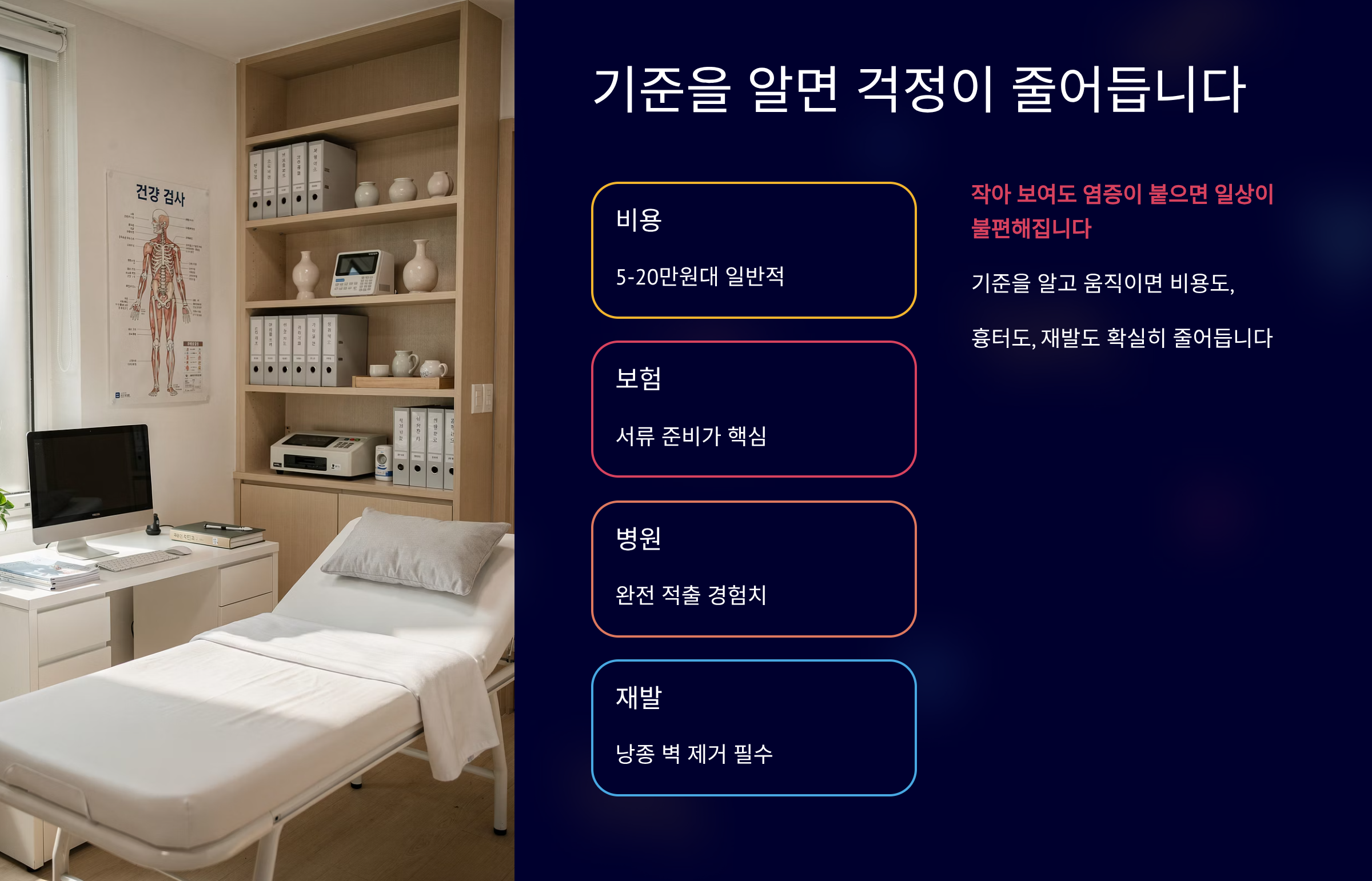 기준을 알고 움직이면, 비용도 흉터도 재발도 확실히 줄어듭니다.