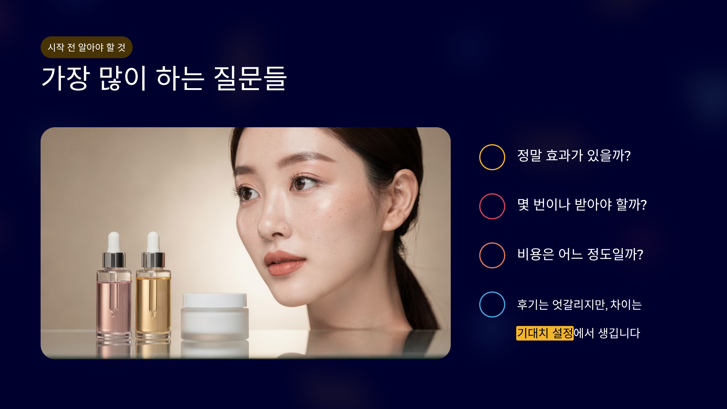 정말 효과가 있는지, 몇 번이나 받아야 하는지, 비용은 어느 정도인지가 가장 많습니다.