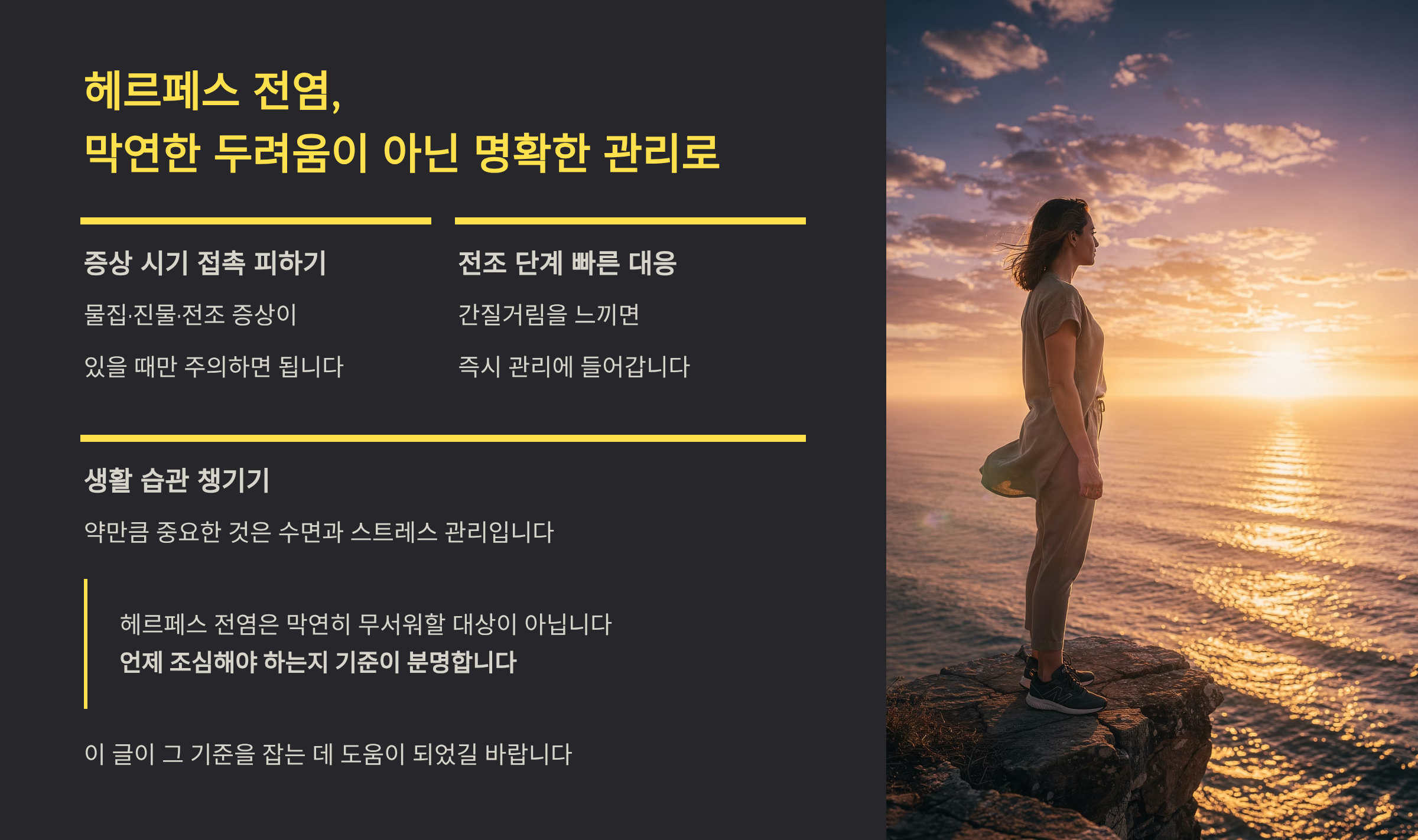 상처·물집·전조 증상이 있을 때의 접촉은 피한다. 이 한 줄만 기억해도 불안이 많이 줄어듭니다.