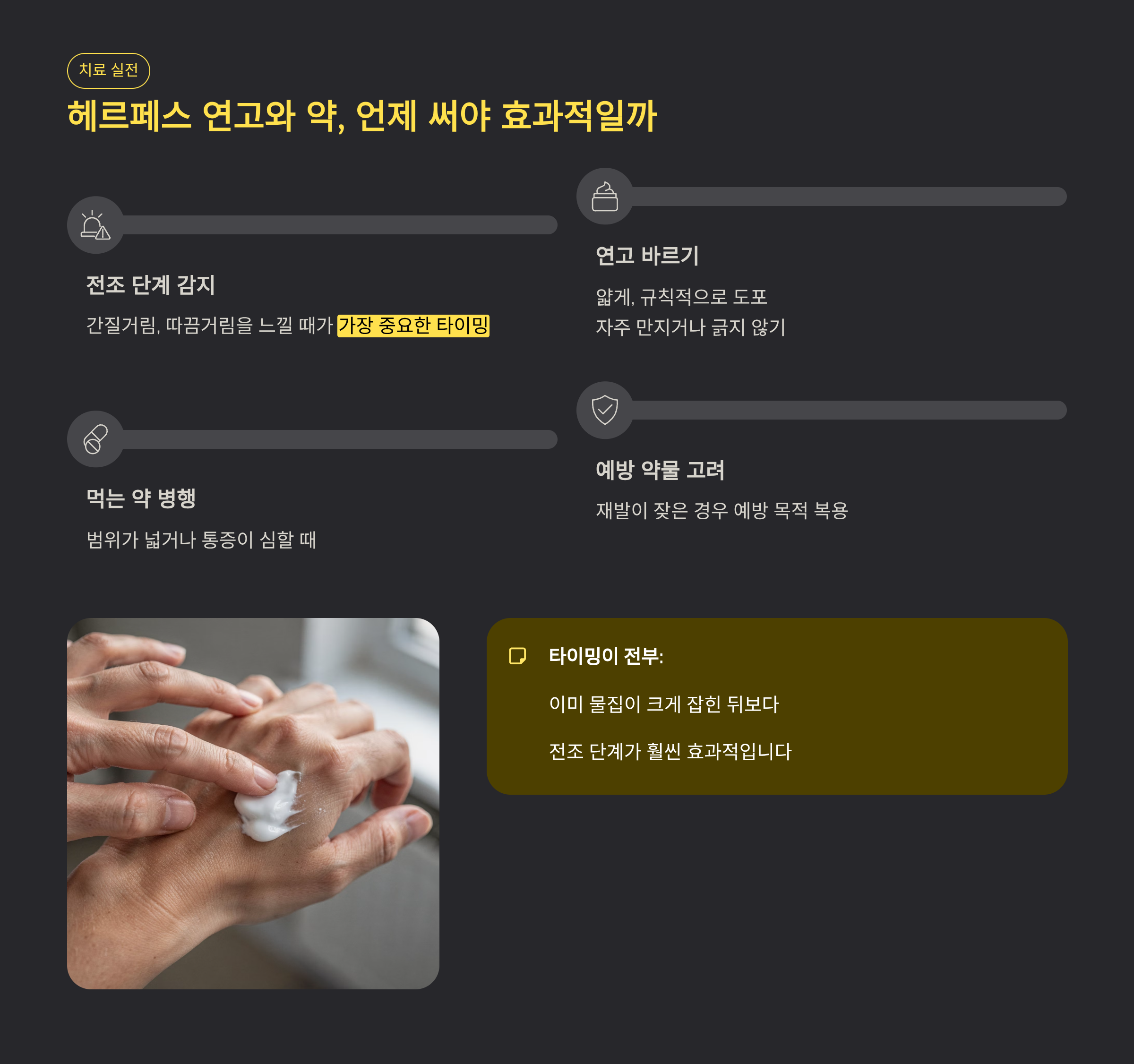 이미 물집이 크게 잡힌 뒤보다는, 간질거리거나 따끔거리는 전조 단계가 훨씬 좋습니다.