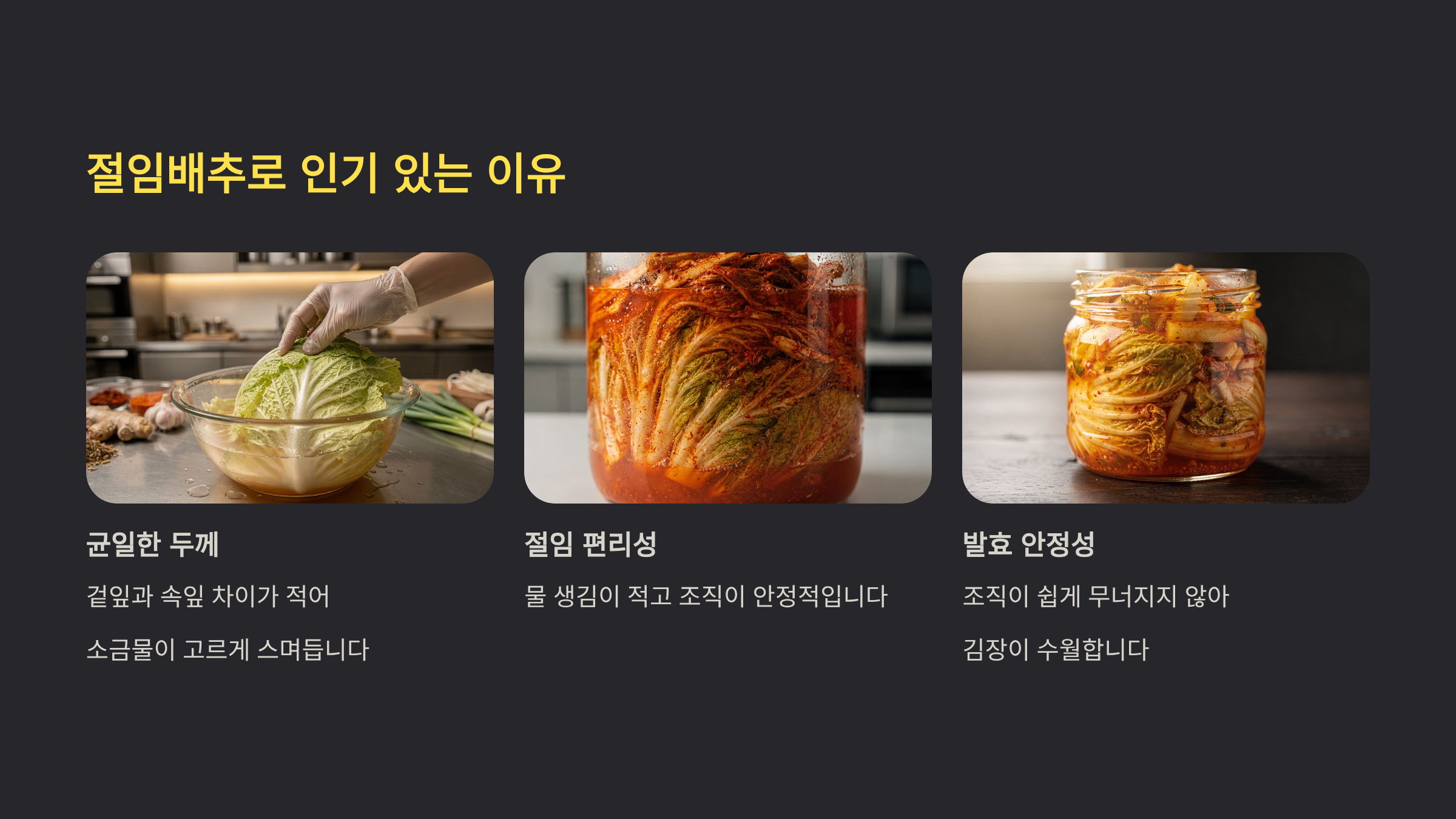 품종 구조와 절임 안정성, 실제 사용 경험이 함께 작용합니다.